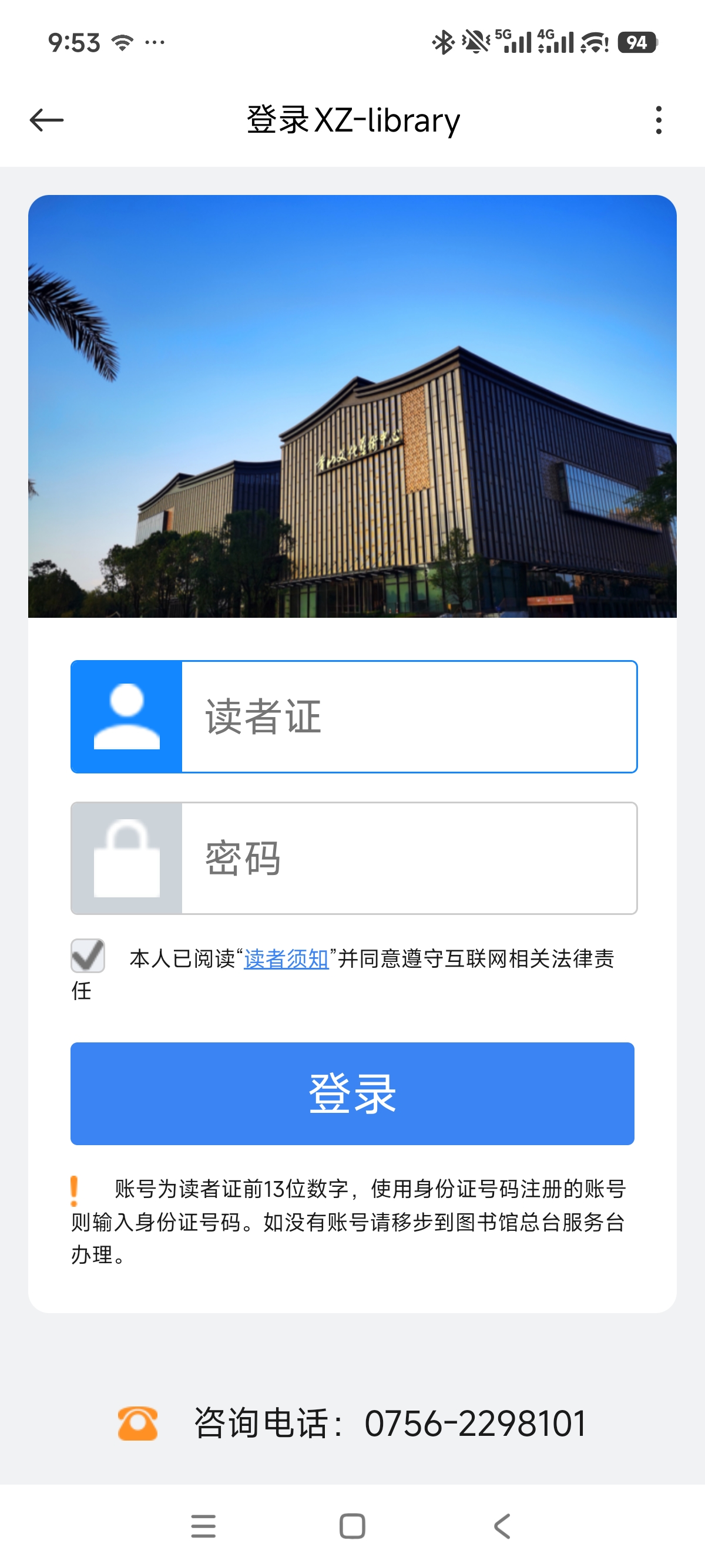 填写读者证号码、密码